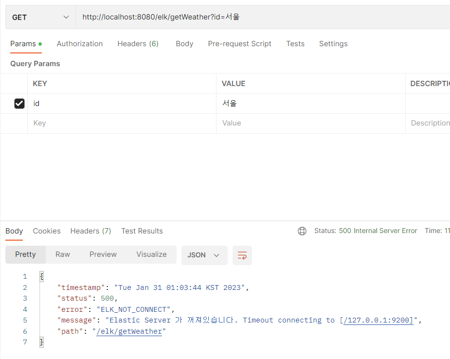 다른 부분은 보지 않아도 되고, elasticServer 시 발생하는 서버 내 에러 중 IOException 이를 발생 시킨다. 이 예외가 발생하였을 시,위 예제처럼 try - catch 를 써도 되고 컨트롤러에서 orElseThrow 를 사용해도 된다.@Transactional public List<Map<String, Object>> getWeatherAllData() throws IOException { long startTime = System.currentTimeMillis(); RestHighLevelClient client = new RestHighLevelClient( RestClient.builder(new HttpHost("127.0.0.1", 9200, "http"))); . . . try { . . . } catch (IOException e) { // 서버 꺼졌을 때 LOGGER.warn("[ELKService][getData] - ElasticSearch 9200 서버 꺼져있음. :: Response = ResponseEntity<ErrorResponse> :: {}ms", (System.currentTimeMillis() - startTime)); throw new CustomException(UserErrorCode.ELK_NOT_CONNECT); } finally { client.close(); } return sourceList; }- throw new CustomException(UserErrorCode.ELK_NOT_CONNECT); 를 던지게 된다.