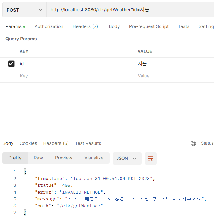 => .post(http://localhost:8080/elk/getWeather?id=”서울”), 405