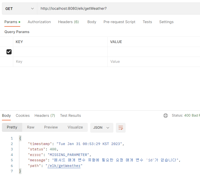 - 잘못된 파라미터가 존재하는 경우 예를 들어, Params 의 값을 넣지 않은 경우